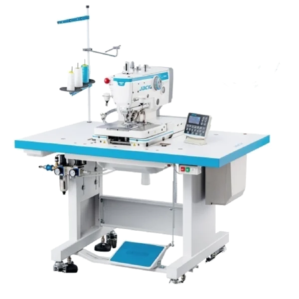 La JACK JK-T9820-02 representa la cumbre de la tecnología en la creación de ojales de ojo (tipo gota). Debido a que cuenta con un sistema de control electrónico avanzado, esta máquina permite configurar la forma del ojo, la longitud del ojal y el tipo de remate (recto, circular o sin remate) desde su panel digital. En consecuencia, el fabricante logra acabados de alta costura que son fundamentales para prendas de vestir masculinas y femeninas de gama alta.