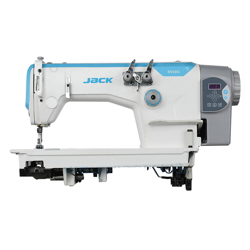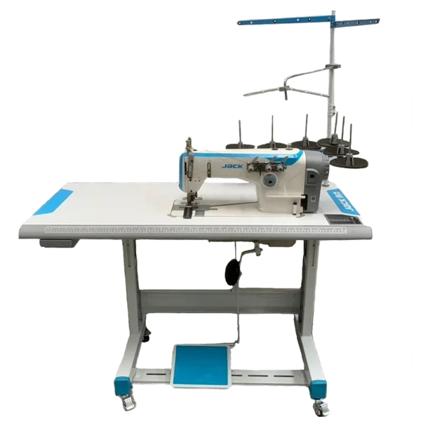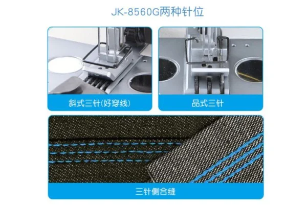 La JACK JK-8560G-WZ-PL es una máquina de coser industrial de cadeneta de 3 agujas, diseñada específicamente para trabajos pesados como la confección de jeans y telas gruesas. Destaca por incluir un puller trasero metálico que facilita el arrastre uniforme de materiales difíciles.
