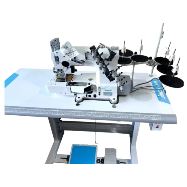 La JACK JK-8009VCDI-04085P es una máquina industrial de cadeneta múltiple (multi-needle) diseñada para procesos de alta producción en la industria textil. Está especialmente desarrollada para la confección de pretinas, aplicación de elásticos y costuras decorativas en prendas deportivas y jeans.