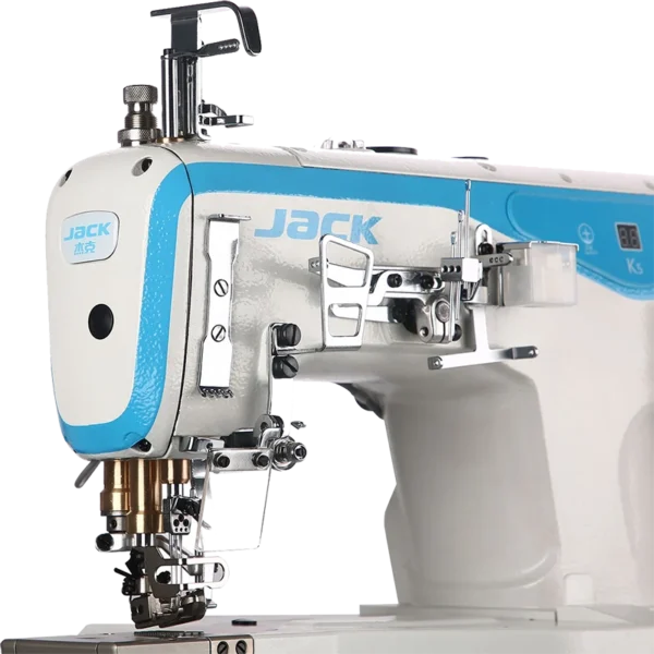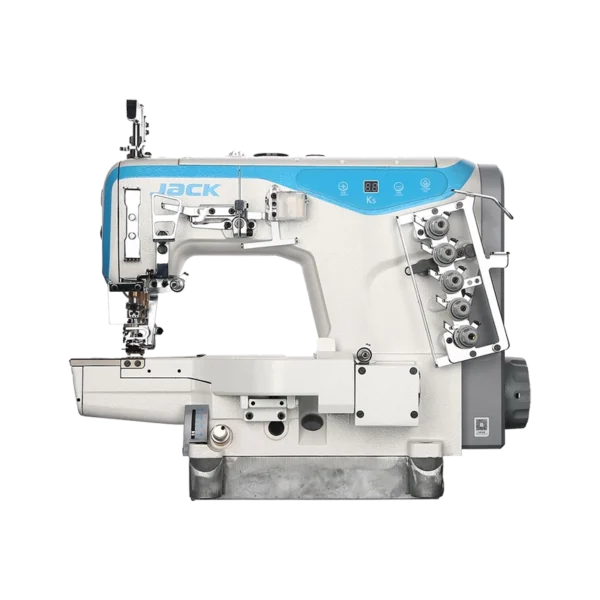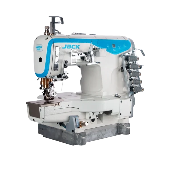 La JACK K5-D-01GB×364 representa un salto importante en diseño, ya que es una máquina recubridora (collareta) de cama cilíndrica (brazo pequeño). A diferencia de las series W4 o W5 que son de cama plana, la serie K5 está diseñada específicamente para costuras circulares o tubulares.
